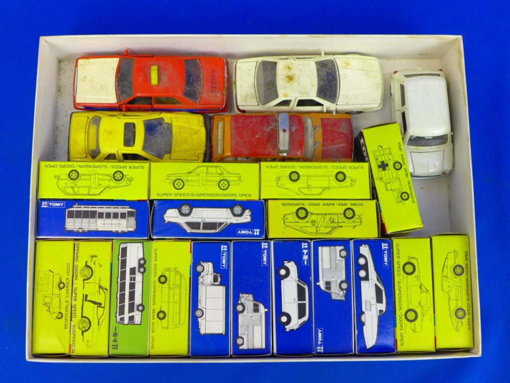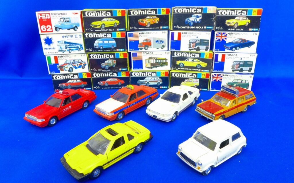 この年代のトミカのミニカー形が今のものと違って角ばっております。箱付で、黒箱・青箱両方ございました。